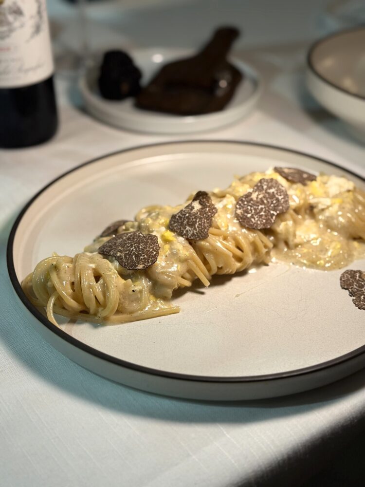 Lo spaghettone con Riello e tartufo, cremoso e avvolgente, esprime una sensualità più morbida e profonda. È in questo passaggio che entra in scena il Clos La Gaffelière 2020, elegante e morbido, un rosso francese che accompagna i primi con naturalezza e aggiunge profondità al percorso.