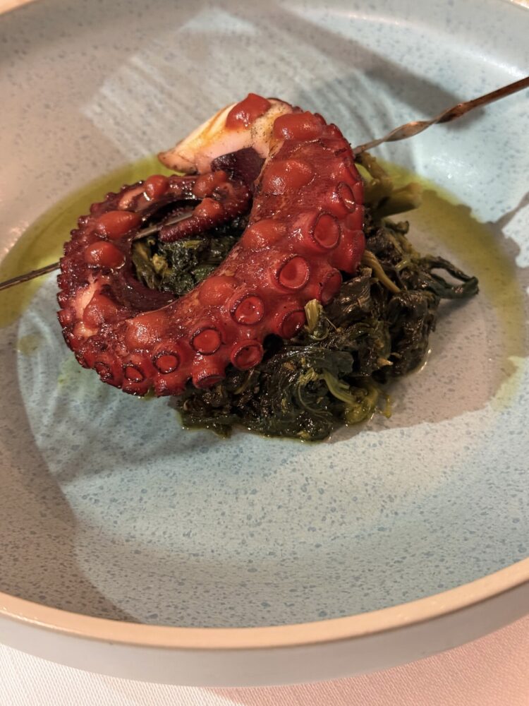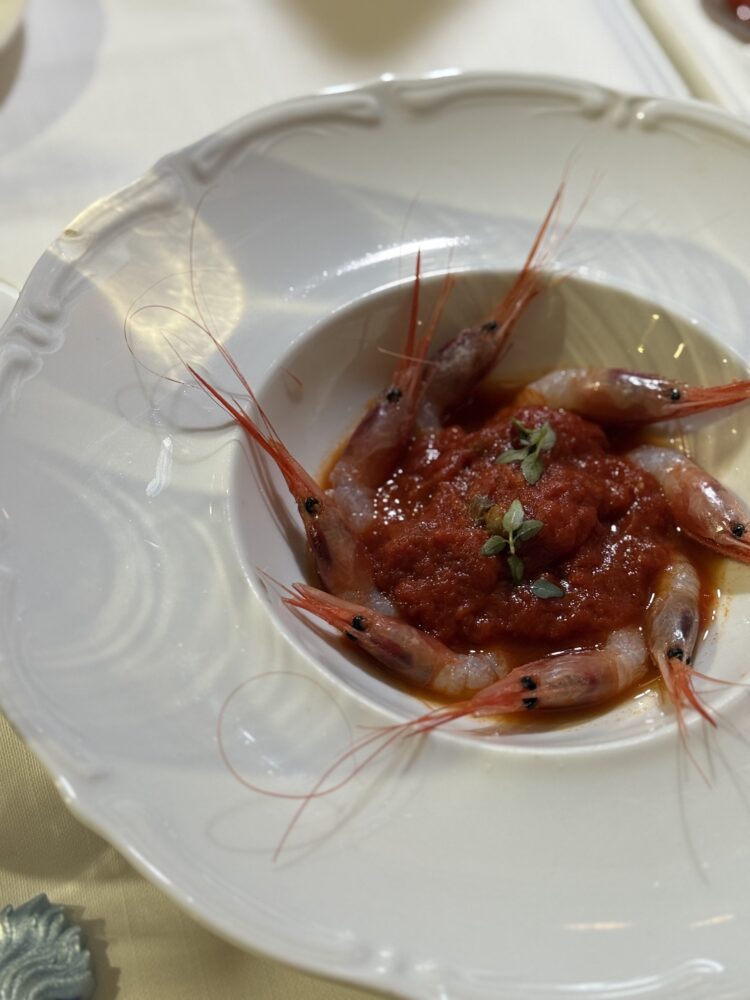 Lo spiedino di polpo, tenero e lucido, poggia su friarielli cotti con cura mentre la nota dolce della papaccella crea un’armonia naturale. Il gâteau ai porcini profuma di bosco e la sua crosticina richiama piacevolmente la cucina di casa. I gamberi gobbetti affogati alla puttanesca, già puliti con attenzione, risultano intensi, mediterranei, irresistibili.