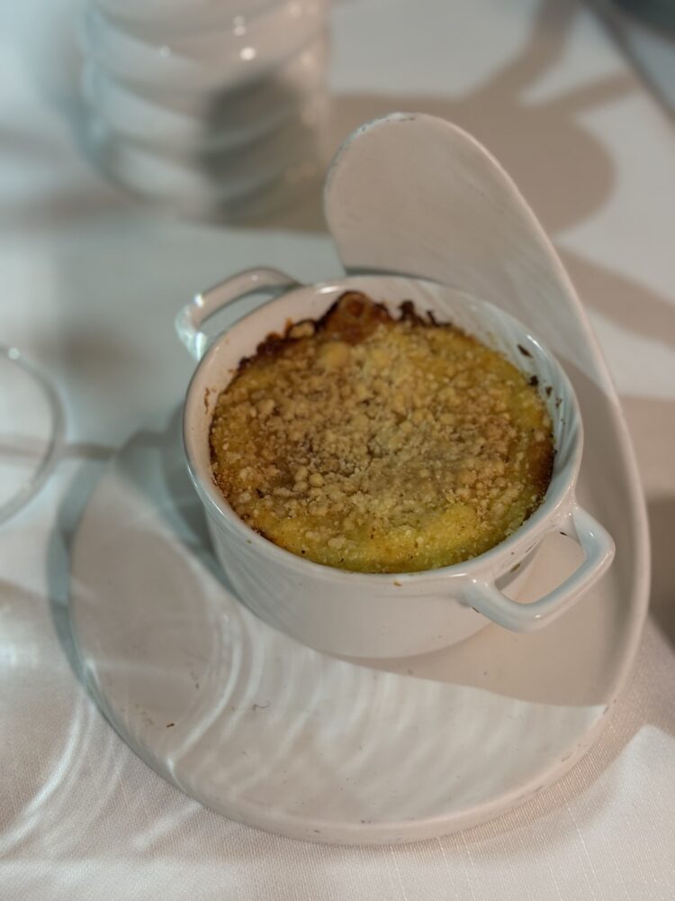 Prima del dessert arriva un assaggio che sorprende, una forchettata di spaghetto aglio e olio, gesto semplice e identitario che richiama la cucina di casa e crea una pausa spontanea prima del finale.