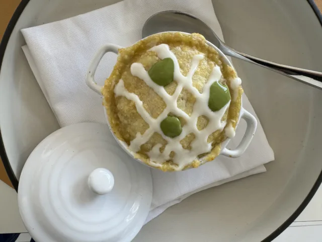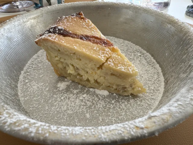 Armonì, servito con due creme vellutate, che supera la prova senza esitazioni. Tanto che decidiamo di portarne via anche due, tra cui la versione speciale al cacao e albicocca Pellecchiella, una combinazione elegante che racconta la stessa idea di cura presente in tutta la proposta.