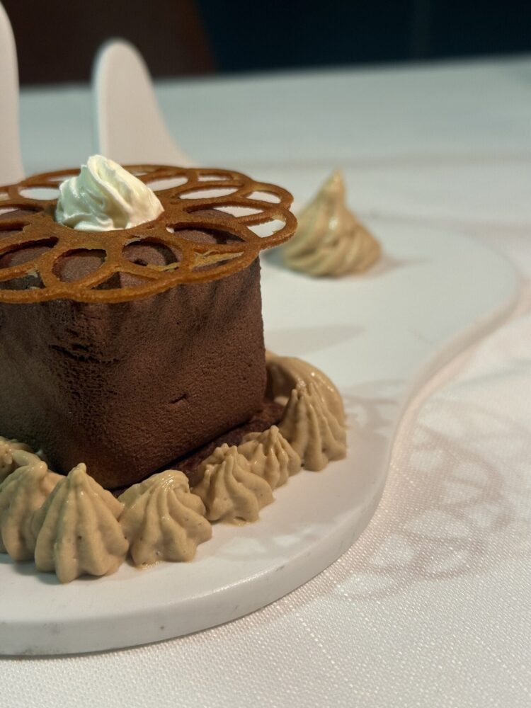 La parte finale è una dolce conferma. Il tiramisù cubico, preciso nelle forme e soffice nella crema, anticipa il momento più atteso, il mini-panettone
