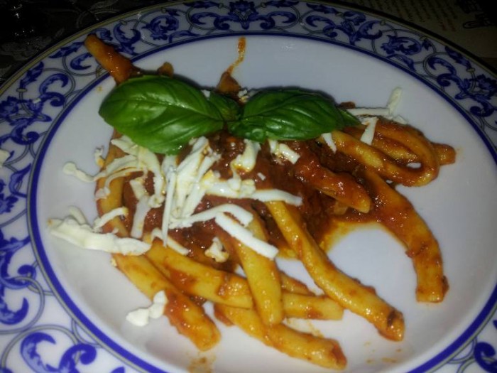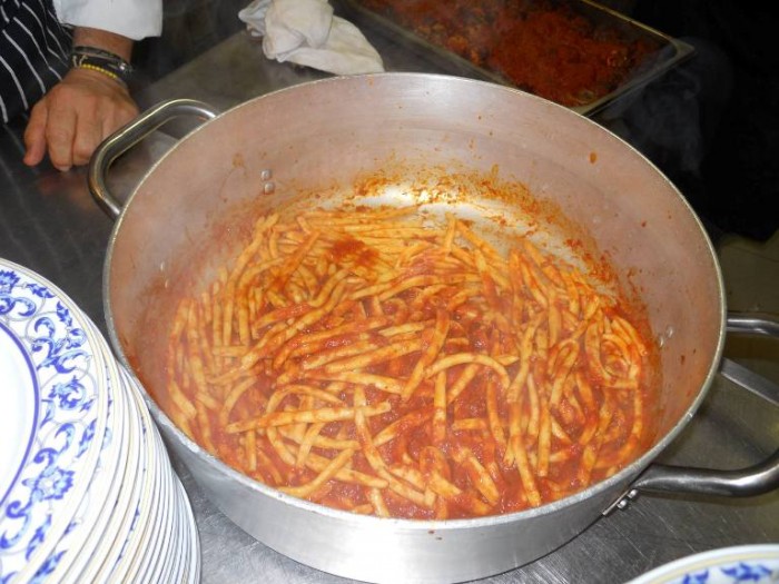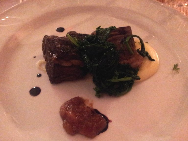 A seguire i primi, Genovese di agnello in raviolo, crema di pecorino e salsa bruna con nocciole tostate e fusilli al ferro, capra in ragù e cacioricotta cilentana. In abbinamento il Possessioni Rosso del Veronese igt 2011 (Corvina e Molinara clone Serego Alighieri 80%, Sangiovese 20%). Di colore rosso rubino, consistente, al naso note di frutta rossa come ciliegia e prugna accenni di spezie (cannella). Di corpo, ben strutturato, caldo ed equilibrato al palato. Lungo finale con richiami di ciliegia, valorizzati sia nel profilo olfattivo che gustativo dal particolare sistema di affinamento in fusti di ciliegio.