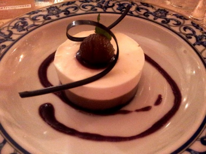 Chiusura con ‘polpettina’ di melanzane al cioccolato e cheesecake alla bufala, dolci preparati dal giovane pasticciere Pasquale Bevilacqua della Pasticceria Mamma Grazia di Nocera Superiore, gustati con un calice di Recioto Classico doc Angelorum 2009 (Corvina, Rondinella, Molinara), tradizionale rosso dolce da dessert della Valpolicella. Le tre uve veronesi che compongono il blend vengono collocate su graticci di bambù nei fruttai in inverno per l’appassimento. Di colore rosso rubino, al naso presenta sentori di ciliegia e frutta sotto spirito, al gusto colpisce per la consistenza, bella dolcezza e acidità. Finale lungo e ottimo equilibrio tra alcool, zucchero e struttura.