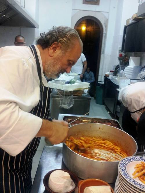 In cucina si muove e coordina i suoi aiutanti con concentrazione e dedizione e la precisione e la sicurezza di ogni suo gesto rapiscono a tal punto che si rimarrebbe a osservare il lavoro pacatamente frenetico per ore senza né stancarsi né distrarsi.