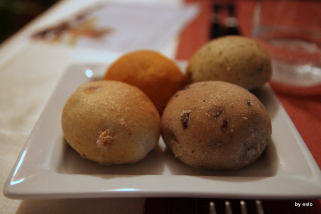 Si parte con la prima entrée che è calamaro fritto su crema di patate alla liquirizia e scarola riccia. Buonissimo il calamaro e leggera la frittura, il tutto ben si lega con la scarola riccia, ma deve fare i conti con il finale dolceamaro della liquirizia. Ci vengono serviti anche dei panetti, preparati da Carmine con la farina Petra di Molino Quaglia e aromatizzati al bacon, alle olive, al pomodoro, al rosmarino e al basilico.