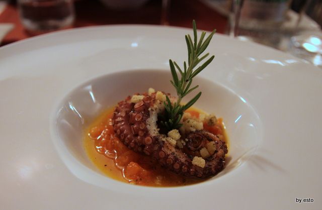 Seconda entrée: polpo arrostito con zuppetta di zucca piccante e croccante al rosmarino. Un piatto equilibratissimo, dove la zucca è dolce e saporitissima e l’abbinamento con i piccoli crostini al rosmarino legano perfettamente la dolcezza dell’ortaggio con la freschezza del polpo.