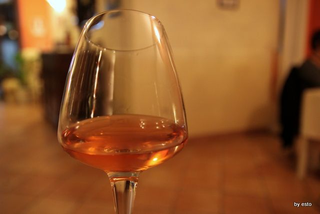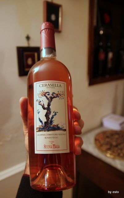 In abbinamento il rosato “Cerasella Vesuviana”, Lacryma Christi rosato DOC di Terre di Sylva Mala, piedirosso 100%. Annata 2010, alcol 13%. Dal particolare colore ramato, questo rosato, derivante dal contatto con le bucce per sole sei ore, si presenta cangiante e cristallino. Gli aromi che si sprigionano dal calice sono evoluti, verso la terziarizzazione, e ci parlano di amarena sotto spirito e confettura di frutti di bosco. Al gusto la forte nota alcolica percepita al naso trova conferma nella forza e nella morbidezza del sorso. Ha una bella freschezza e un finale minerale.