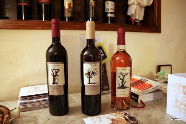 In abbinamento il rosso “Brigante del Vesuvio”, Lacryma Christi rosso DOC di Terre di Sylva Mala, un blend di piedirosso all’80% e aglianico al 20%. Annata 2009, alcol 12,5%. Dal colore rosso granato, particolarmente concentrato e impenetrabile. Al naso presenta aromi di frutta rossa e nera matura, leggera speziatura e un fondo di pepe nero. In bocca ha un sorso robusto, compatto, tannico, fresco e corposo. Bello il finale minerale. Un vino potente.