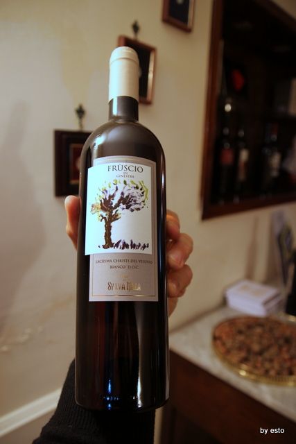 In abbinamento alle due entréeci è stato servito il “Frùscio di Ginestra”, il Lacryma Christi bianco DOC di Terre di Sylva Mala, un blend di Coda di Volpe (Caprettone) all’80% e Falanghina al 20%. Annata 2010, alcol 12,5%. Un vino di un colore dorato, pulito e brillante che al naso rilascia aromi di frutta matura e fiori. In bocca è morbido, caldo e appagante, dotato di bella freschezza, dal sapore minerale e con un finale alla mandorla.