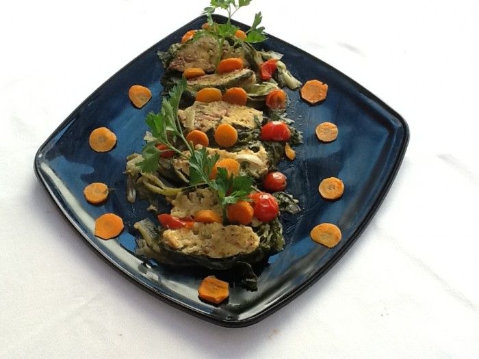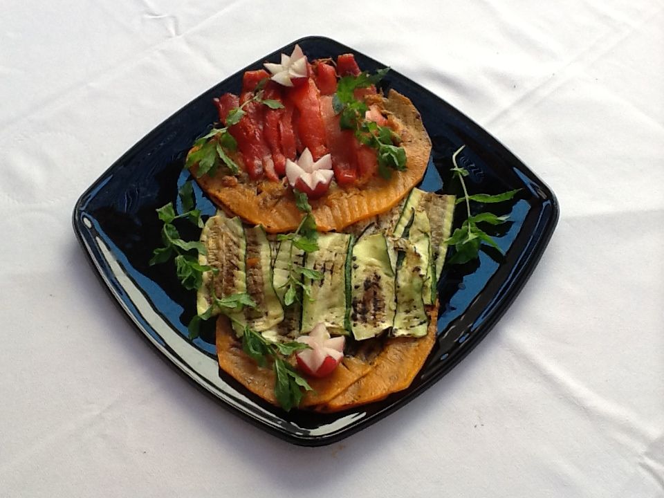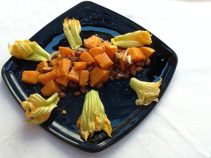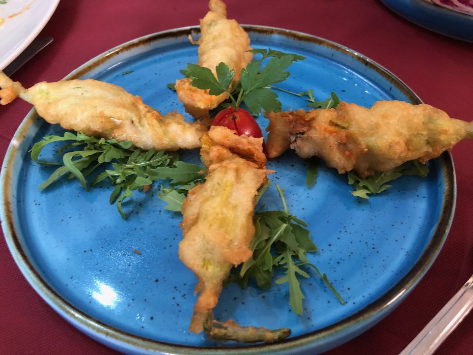Fiori di zucca pastellati ripieni di alici e provola e Baccalà mantecato su letto di zucchine.