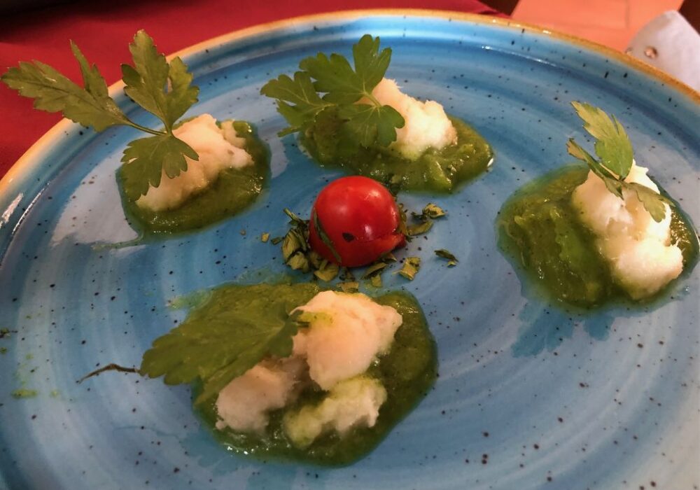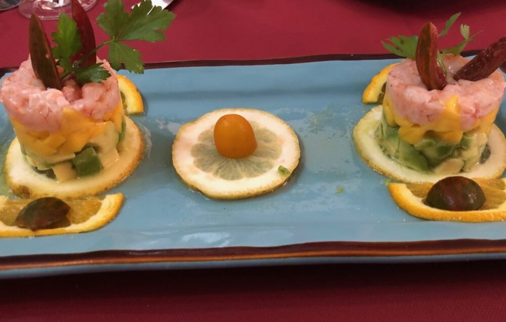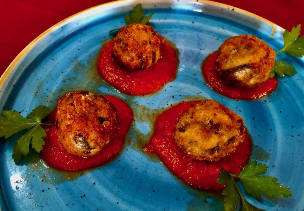 Si inizia con una Tartare di gamberi, seguita subito dopo da un piatto di Polpette di alici su crema di pomodoro.