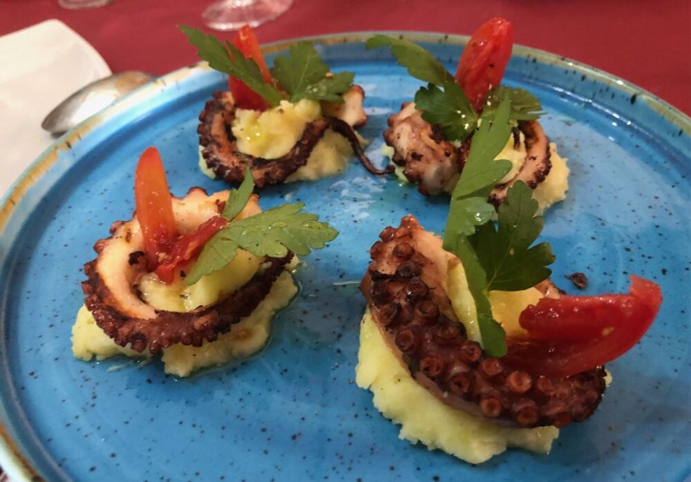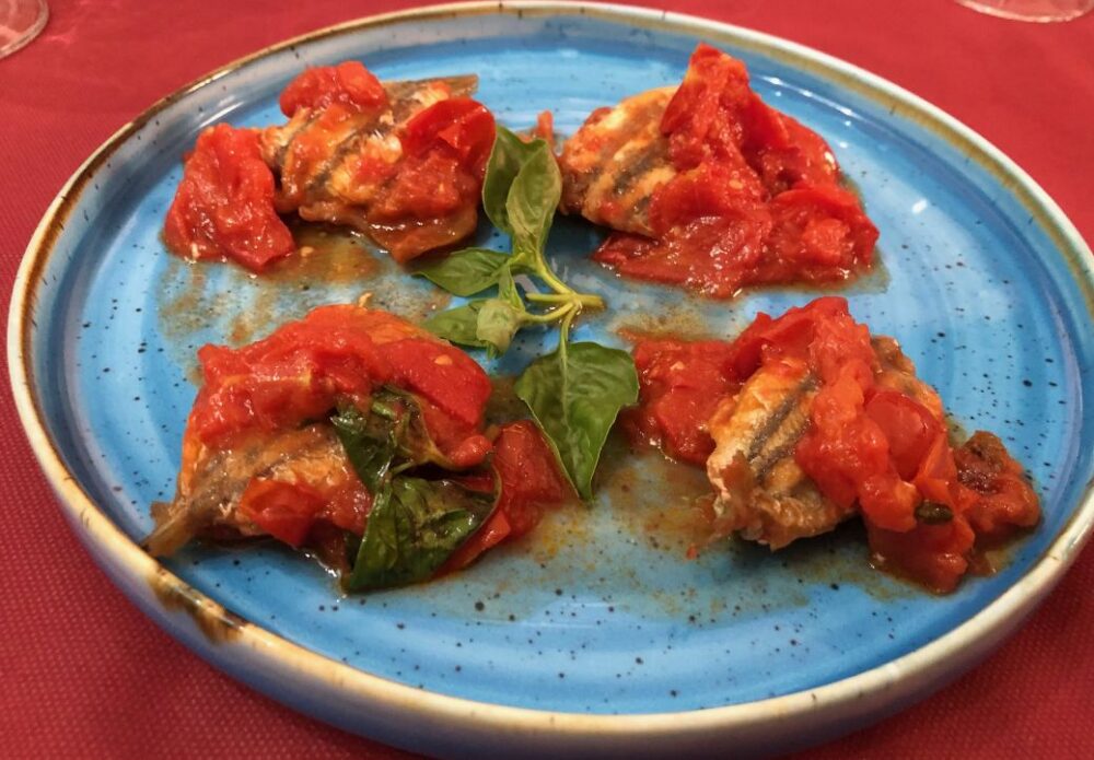 Ecco qui poi Alici cilentane imbuttunate con filetto di pomodoro e Polpo alla griglia su letto di patate insaporite.