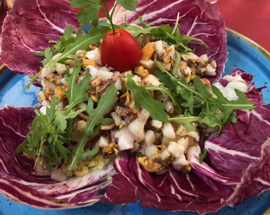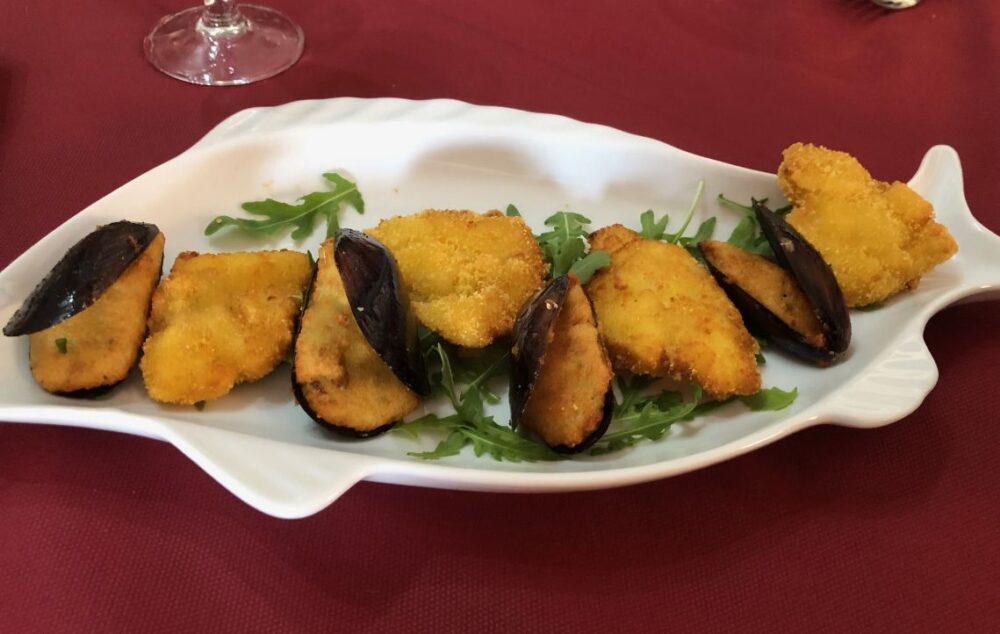 Cozze ripiene di baccalà mantecato e provola ed Insalata di mare.