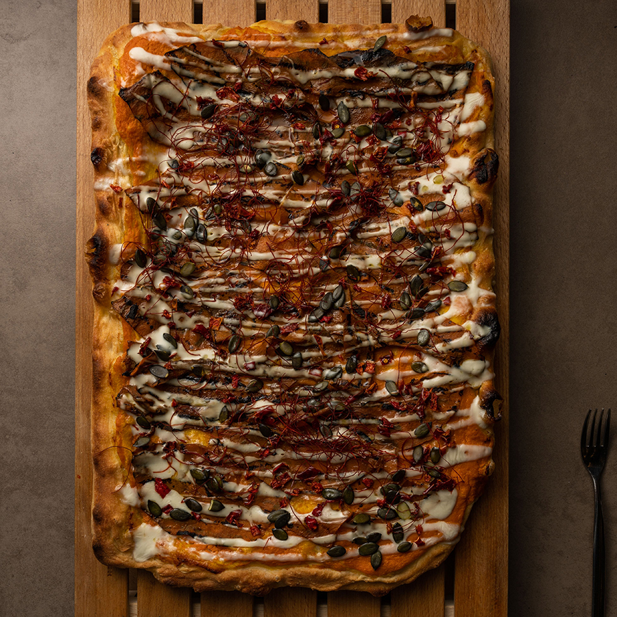 Preparare l’impasto e lasciar lievitare per 24 ore. Trascorse queste ultime, lasciar lievitare per ulteriori 6 ore. Nel frattempo, tagliare la zucca a dadini e cuocere per 20 minuti in aglio, olio e peperoncino. Quando risulterà sufficientemente morbida, spegnere e frullare. Affumicare su ghisa i filamenti di scarto e condire. Dopodiché, stendere l’impasto della pizza e cuocere in forno per 20 minuti a 250 °C. Aggiungere il latticello e cuocere per altri 5 minuti a 200 °C.