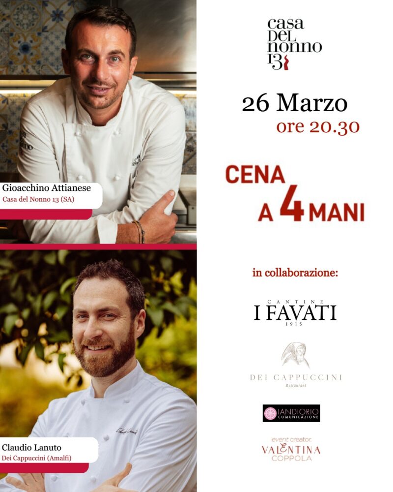 Il 26 marzo, Casa del Nonno 13 ospita una Cena a 4 Mani che celebra l’incontro tra terre di mezzo e Costiera Amalfitana, un dialogo nel segno del buon gusto tra tradizione, territorio e creatività. La cornice sarà quella unica del celebre ristorante di Mercato San Severino, un palazzo storico, con la sua suggestiva cantina scavata nella pietra, che rende l’esperienza ancora più speciale.
