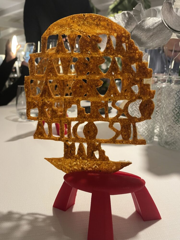 Da Attico l’aperitivo è iniziato con olive fritte ripiene con il brodetto alla sanbenedettese accompagnate da un cocktail con arancia bionda del piceno e gin, biglie rosse con fegato di merluzzo e gelatina di Campari e Tacos croccante ai semi con ricotta salata e carciofi alla brace dal sapore fumé.