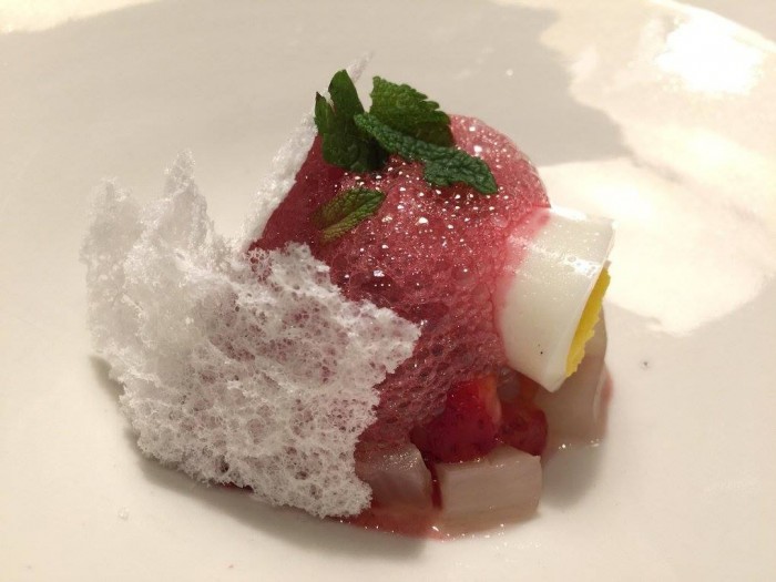 Terra, cannellone al tarassaco con fragole, finocchio, cracker di latte e bubbles di rape affumicate