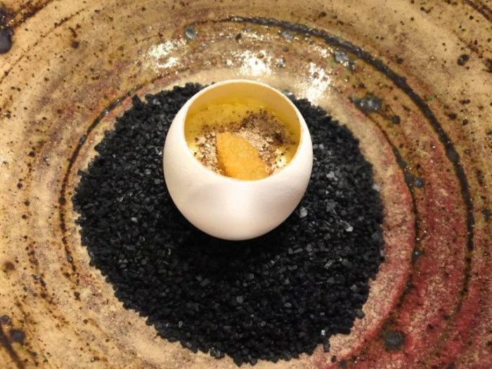 Terra, chips di patate al rosmarino e cioccolato bianco, pralina di gelato all’olivello spinoso, croccante di lino, marshmallow di more di bosco, torta tronco alle mele affumicate, zucchero filato con erbe