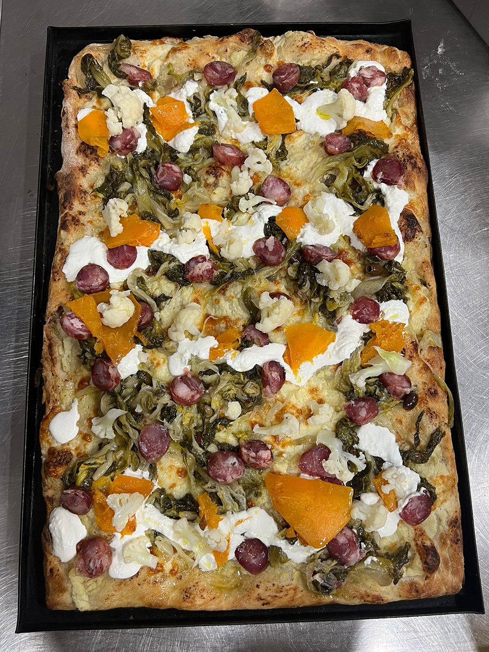 Inserire la farina, il lievito e una prima parte di acqua nell’impastatrice ed impastare. Una volta che gli ingredienti saranno ben amalgamati, aggiungere il sale e la rimanente parte di acqua. Trasferire l’impasto in un contenitore e far riposare in frigo per 60 ore. Trascorso questo tempo, stagliare l’impasto e formare i panetti. Far riposare per 10 ore circa a temperatura ambiente. Nel frattempo, bollire il cavolfiore (in acqua e sale). Una volta cotto, frullarne 300 g e conservare la restante parte, per utilizzarla poi come decorazione. Tagliare la zucca a fettine, aggiungere il sale e soffriggere leggermente. Successivamente, pulire e lavare la scarola, cuocere in acqua bollente e sale, scolare e lasciar raffreddare. Condire con olio, olive e capperi. Stendere l’impasto della pizza nella teglia e aggiungere uno strato di crema al cavolfiore e il fiordilatte. Infornare per 12 minuti a 300 °C.