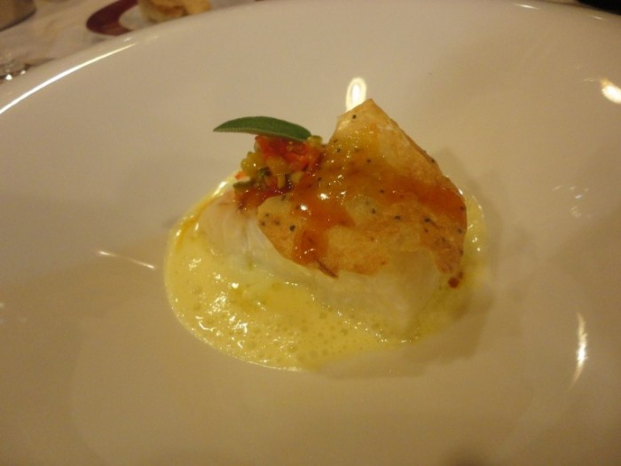 Baccalà in olio cottura emulsione al limone, verdure croccanti, marmellata di Corbarino e cialda di finocchio