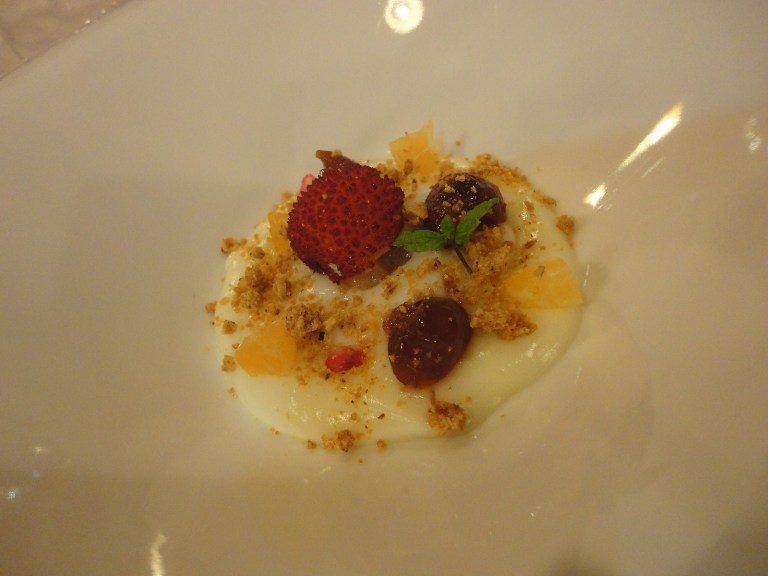 Dessert: Il frutteto del Moera,Crema bianca all amarena fejola corbezzolo mandarino melograno e biscotto alla nocciola