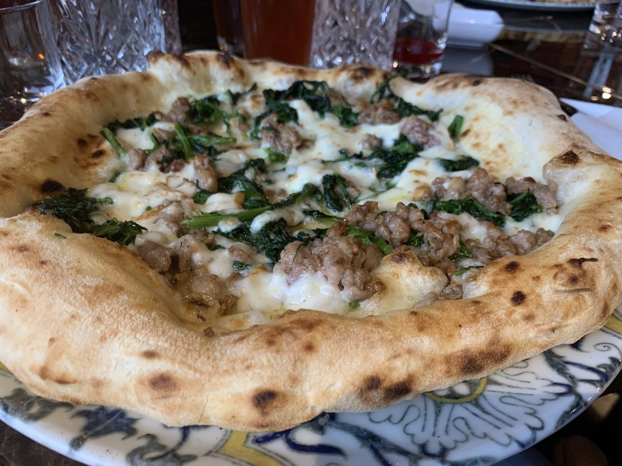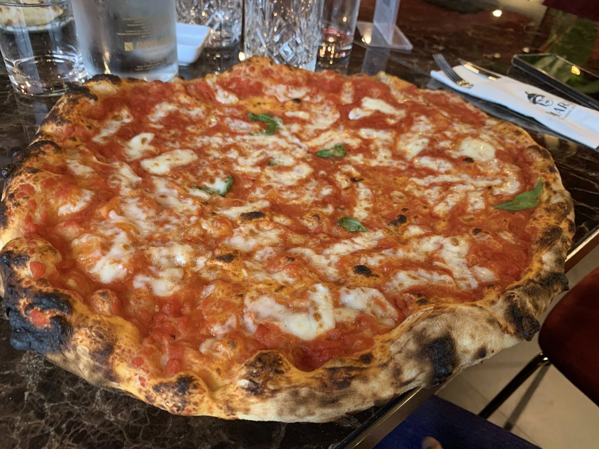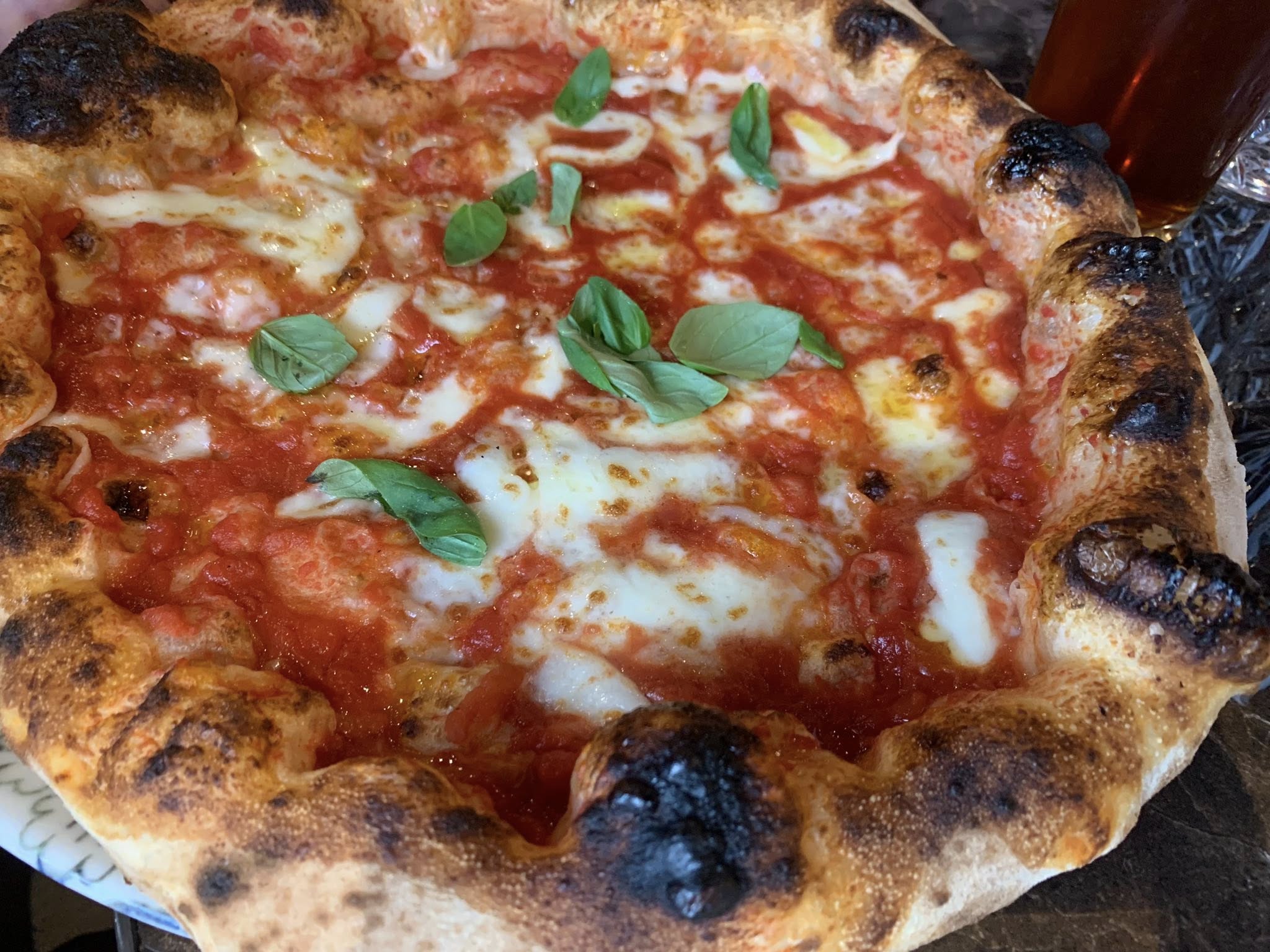 Il menu offre diversi piatti della cucina campana, come gnocchi alla sorrentina, genovese, scarpariello e così via ma il cuore qui batte per la pizza napoletana, nella doppia versione “contemporanea” e a “ruota di carro”. Per entrambe il punto di forza, spiega Daniele, è senza dubbio il lavoro e la ricerca sulla farina giusta (tipo 0 a basso indice glicemico, nel suo caso) che – più ancora che i tempi lunghi di maturazione e lievitazione che pure rispetta – portano ad una pizza soffice, dal boccone delicato, di grande leggerezza.