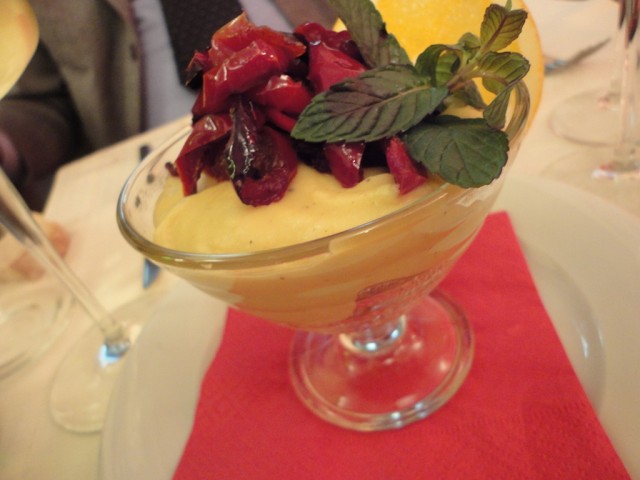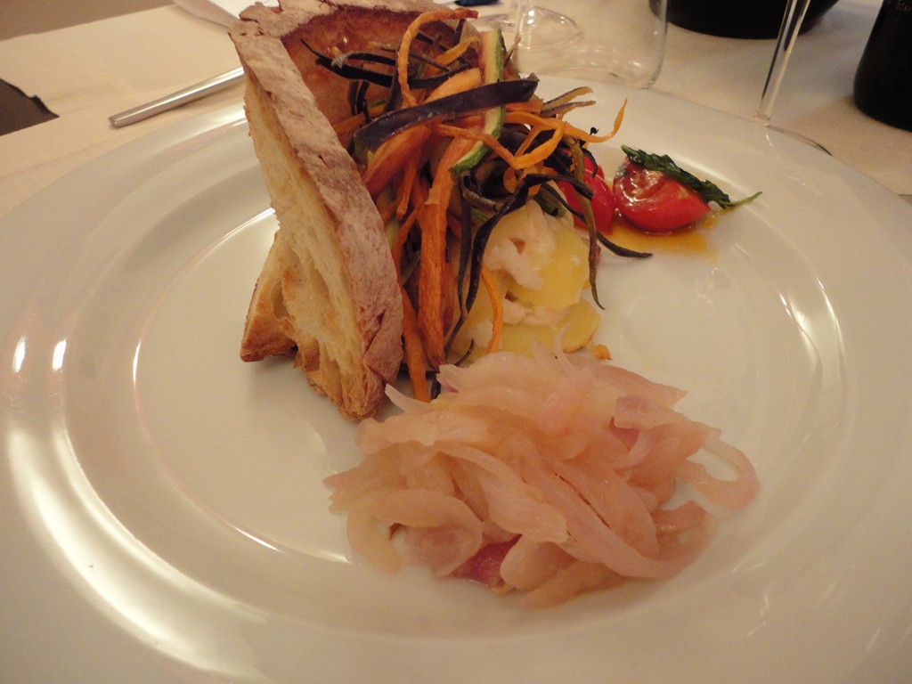 La Diana ci presenta una carta chilometrica, che ci dà, e non poco , l’imbarazzo della scelta. La questione viene risolta velocemente e d’imperio, dal Pigna con queste parole : vogliamo assaggiare tutto, però una porzione sola per ogni portata (eravamo in tre)!!! Si parte con la “Coppa di baccalà con vellutata di patate di S. Michele allo zafferano e papaccelle fritte”…aheeeè, e quissù urgono bollicine!!!