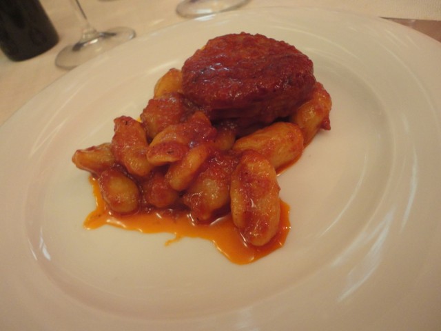 Più leggero del ragù napoletano, ma comunque molto gustoso. Nei giochetti di abbinamento che abbiamo fatto a tavola, il Pigna ha provocatoriamente proposto di verificare la struttura del Fiano di Avellino su questo piatto : dopo il primo sorso di accompagnamento, silenzio tombale in sala!!! Sembrava avercela fatta, ma dopo qualche minuto il ragù è ritornato…un quasi-goal, Ciro…dobbiamo studiare ancora!!!