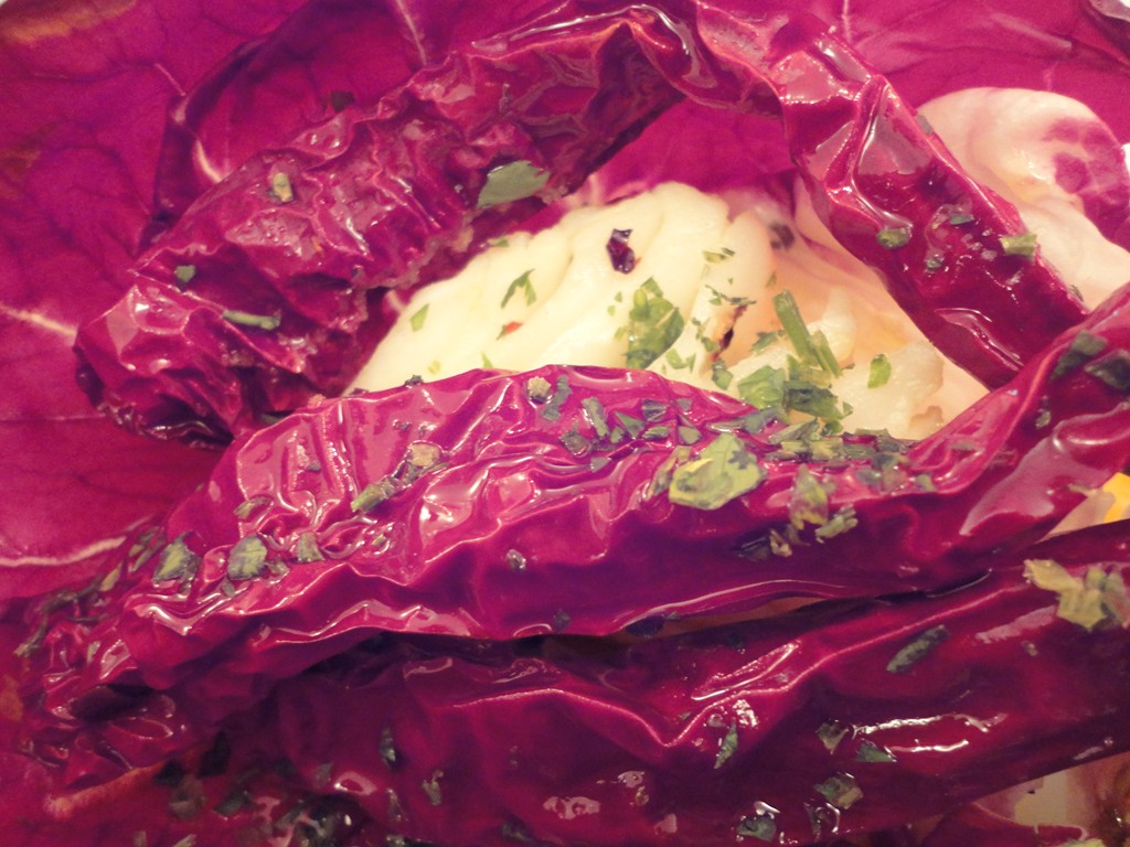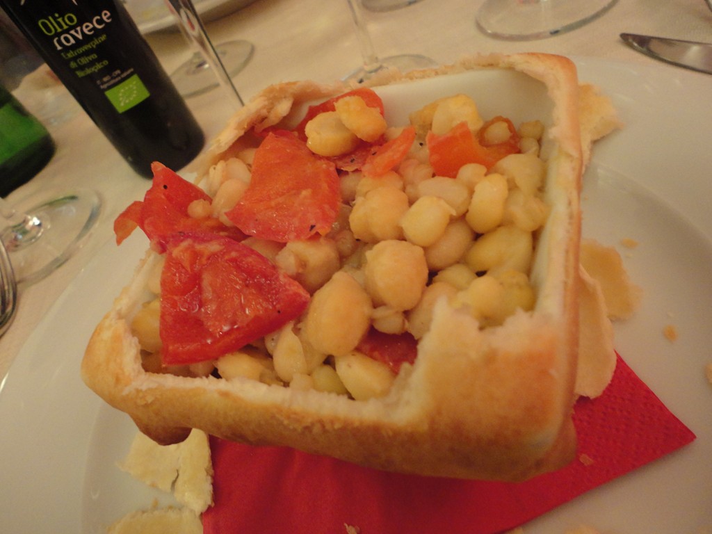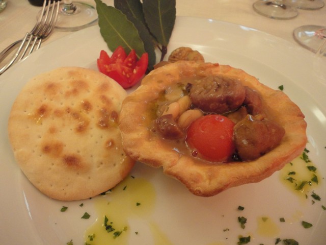 A seguire “millefoglie di baccalà, provola affumicata e patate su julienne di verdurine croccanti, salsa di Ramata di Montoro e pomodorino di Montecalvo. Bel gioco di consistenze ed equilibrio sensoriale. In abbinamento, qualcuno ha continuato con le bollicine, mentre io ho bevuto il Fiano 2010 del Picariello. Arriviamo alle zuppe : la classica, quella porcini, fagioli e castagne “Verdole” di Serino, molto delicata e servita in un contenitore-cestino fatto di pasta di pane, molto simpatico nell’aspetto e nella pratica, infatti ha preservato eccellentemente la temperatura della zuppa.