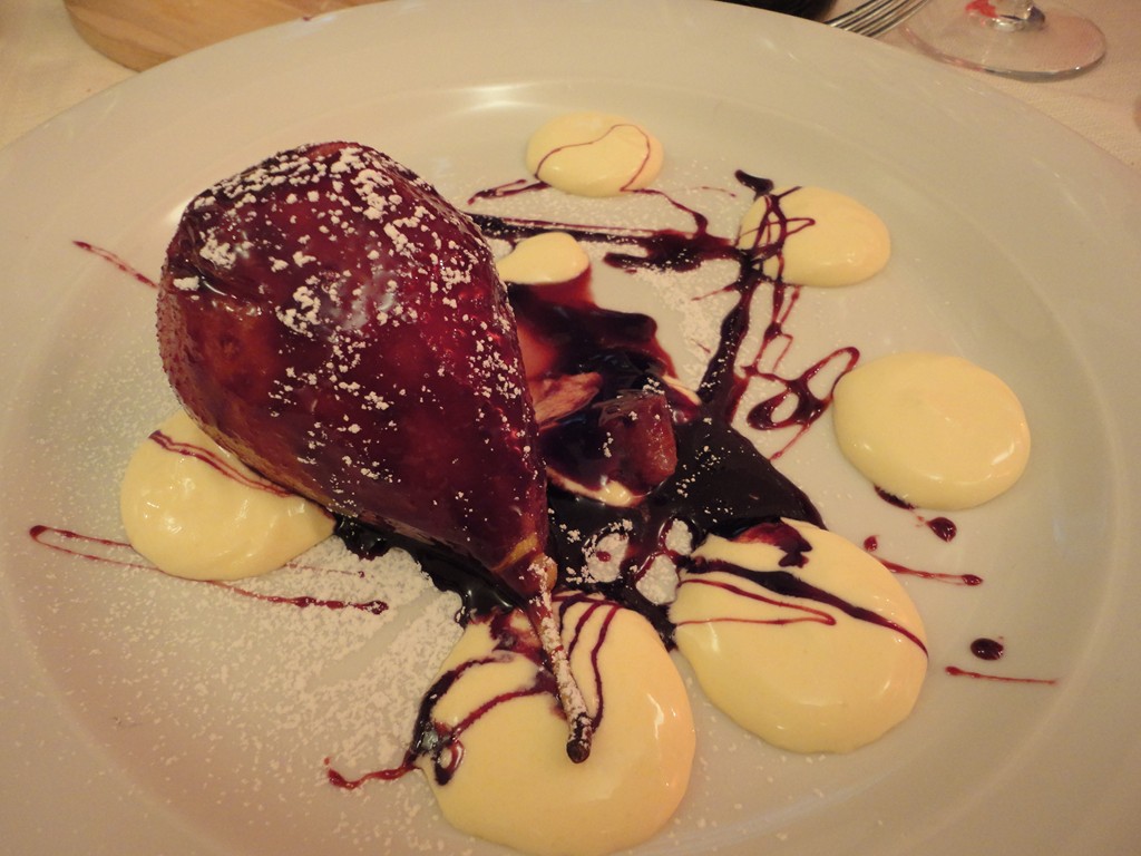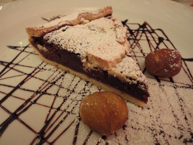 A seguire…i dolci : Crostata di “Marrone Montorese”, che si scioglieva in bocca, Pera Coscia cotta nel Taurasi, ripiena di crema al mascarpone e riduzione di Taurasi, da applausi e infine tortino al cioccolato, che Diana c’ha confessato di fare anche, quando dispone di ottima e sicura materia prima, al sanguinaccio…sssssss, non dite niente a nessuno, però!!!