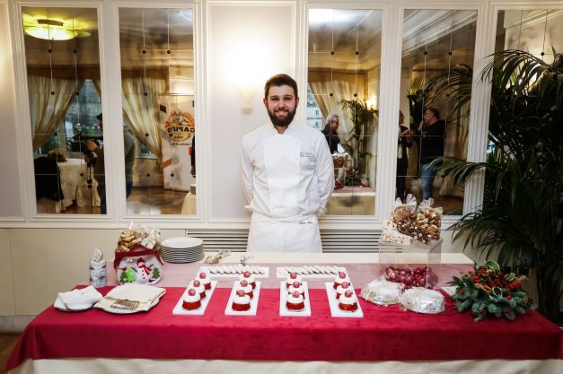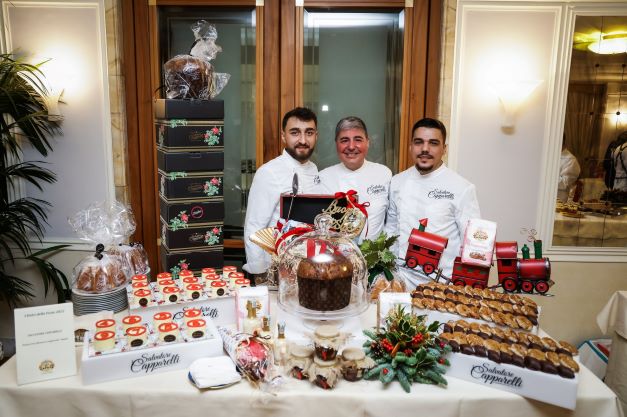 Sal De Riso, Maestro Pasticcere della Sal De Riso Costa d’Amalfi nonché presidente dell’AMPI – Accademia Maestri Pasticceri Italiani, ha portato in degustazione dei bocconcini di babà ai frutti di bosco, inzuppati in una bagna alla vaniglia, rivestiti di glassa al lampone. Tra i suoi lievitati natalizi, il Panettone Passione napoletana, farcito con bucce d’arancia candita, uvetta sultanina australiana, albicocche del Vesuvio, cedro di Diamante e fichi bianchi secchi del Cilento D.O.P. e il Panettone Oro Puro, farcito con cioccolato fondente Sur Del Lago 72% Venezuela e ricoperto di foglia d’oro. Non è mancato l’elemento scaramantico adatto soprattutto alle feste di fine anno: corni di cioccolato ripieni di pralinato utilizzabili anche come segnaposto e un bellissimo corno rosso, sempre ripieno di pralinato, che ricorda nell’aspetto la più raffinata ceramica di Vietri, adatto a troneggiare sulla tavola di Capodanno.