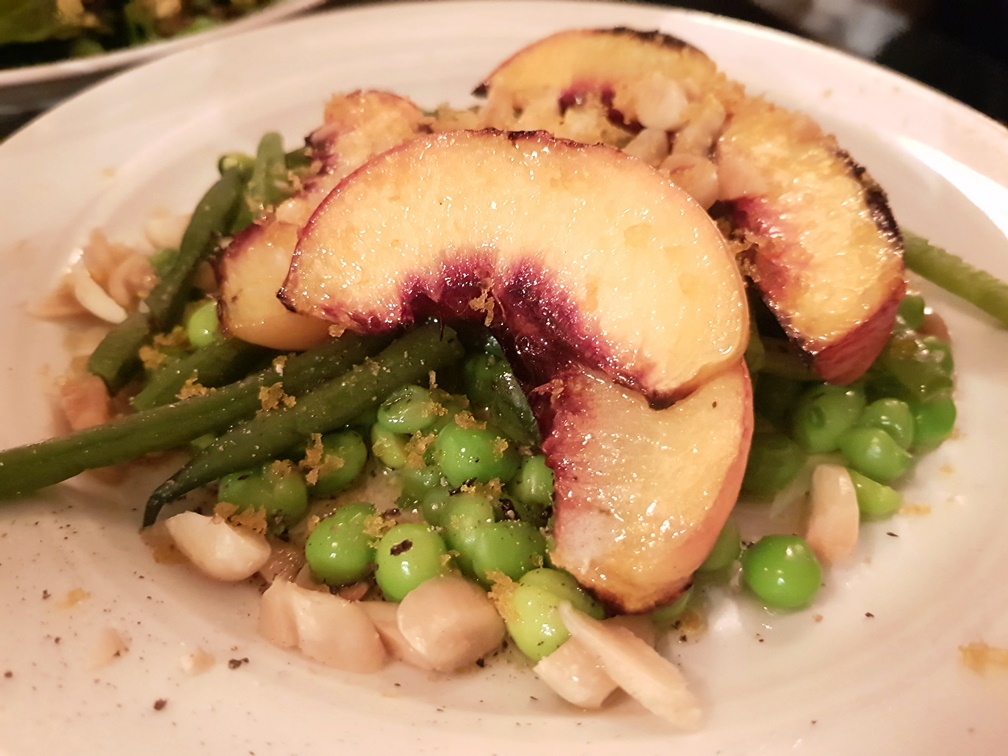 - Insalata di pesche, fagiolini, piselli, bottarga e mandorle