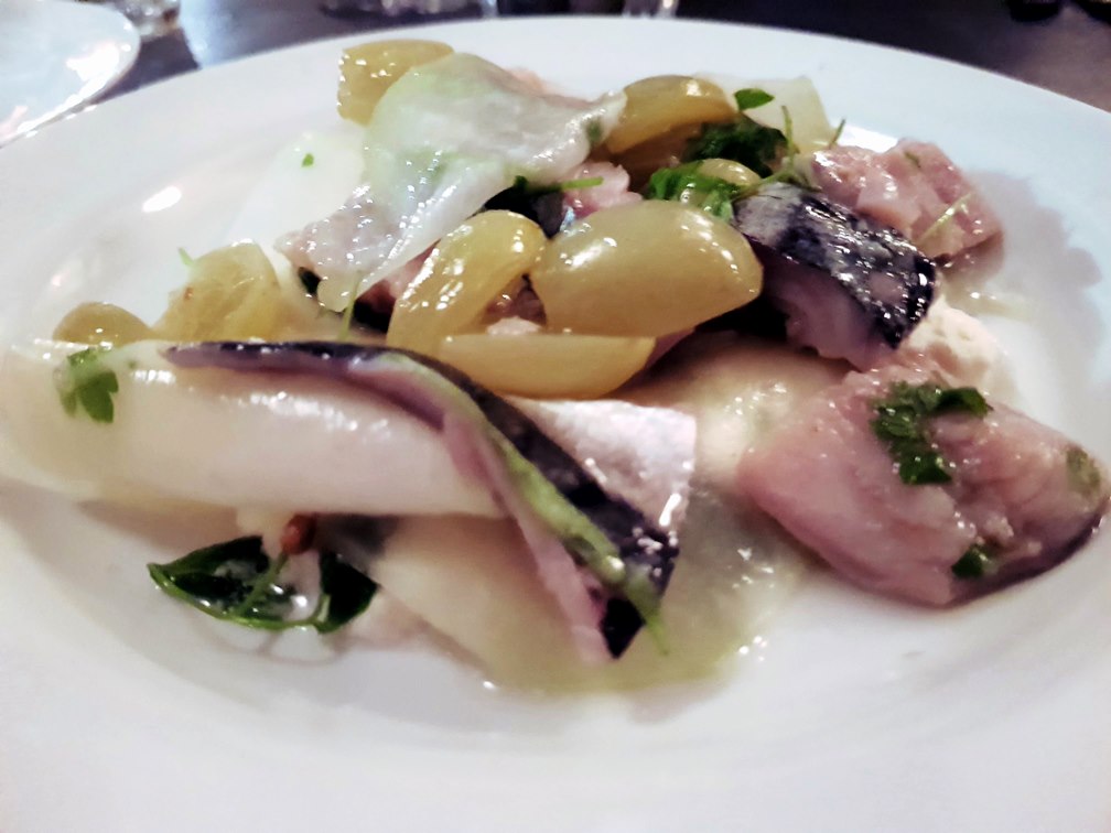 - Sgombro marinato con rapa bianca, uva spina e rafano