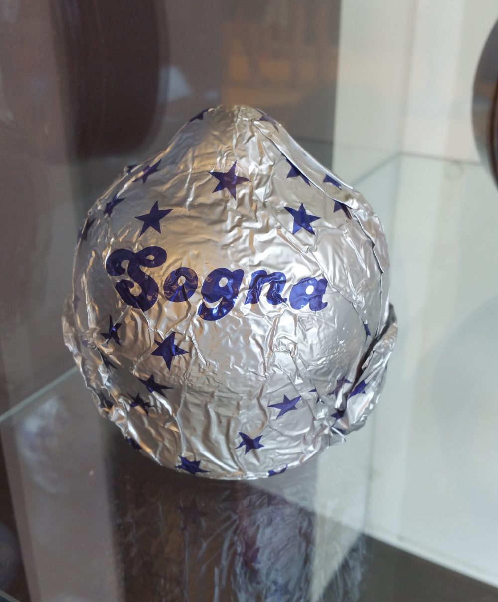 Due metri di altezza, sette metri di larghezza, 5.980 kg di peso, entra nel guinness dei primati come cioccolatino più grande al mondo. Al suo interno il cartiglio “Un Bacio da record per la città più dolce del mondo”.