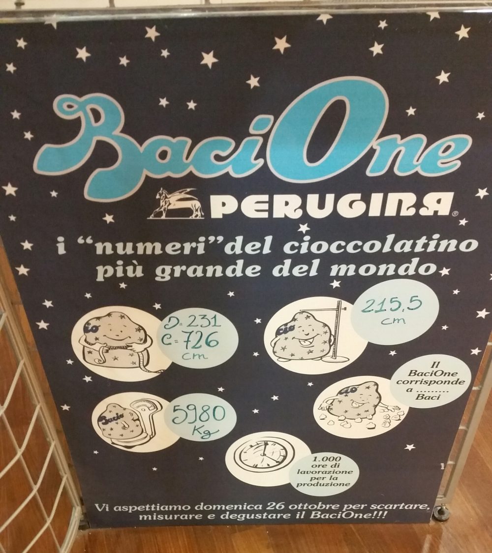 Il bacio più grande è stato creato dai maestri cioccolatieri, all’interno della scuola del cioccolato della Perugina, in occasione di Eurochocolate – festa del cioccolato che si svolge ogni anno a Perugia nel mese di ottobre – con circa trentamila barrette al gusto bacio e una colata di cioccolata fondente, dopo quasi 4 mesi e mille ore di lavorazione.