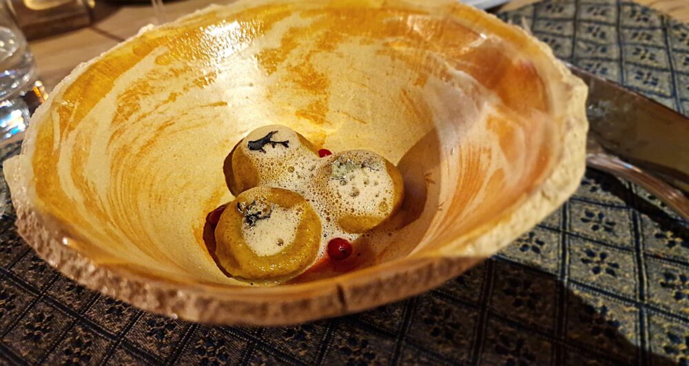 Emblematiche alcune preparazioni che parlano la lingua della fermentazione e del territorio: pane con lievito madre e miso, ad esempio. Indimenticabili il raviolo “5 shades of bread”: raviolo di pane di cui riporto descrizione perché credo sia l’esempio massima della filosofia di casa.