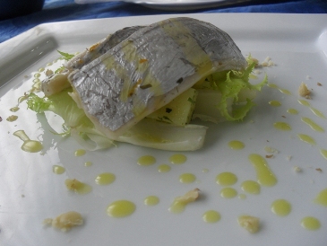 Bandiera marinato all’arancia su insalatina di riccia, patate all’erba cipollina e granella di pistacchi