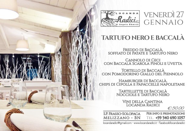 Per la serata di venerdì 27 gennaio Angelo ha pensato di partire con Freddo di baccalà – Soffiato di patate e tartufo nero, per proseguire con Cannolo di ceci con baccalà, scarola-pinoli e uvetta. Spazio poi al Tortello di baccalà con pomodorino giallo del piennolo e Hamburger di baccalà – Chips di cipolla e papaccelle napoletane. In chiusura Tartelletta di baccalà nocciole tartufo nero.