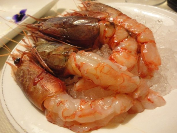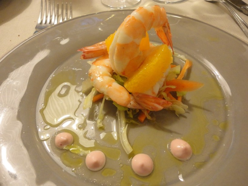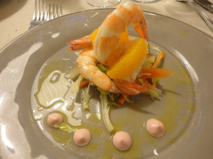 Ottime le noci, ma strabilianti i taratufi, in Campania li chiamiamo “Carnummole”, (Microcosmus Sabatieri). Il sapore è caratteristico di iodio, amarostico e intenso, anche nel profumo…l’accostamento alla parola tartufo è motivato dal forte aroma di acido fenico che si avverte anche nei tartufi (di terra) e perciò anche questo è considerato un potente afrodisiaco. Deliziose e tenerissime, infine, le seppioline crude!!! Chiedo a Diego – ma qual è il segreto di tanta bontà? – Mi risponde che non c’è segreto, bisogna solo affidarsi alla natura, a ciò che il mare ti dà quotidianamente, senza voler forzare la mano. Il menù è dettato, perciò, dal pescato del giorno e dall’esperienza del ristoratore di selezionare una materia prima ad altissimi livelli che il mare della Puglia generosamente elargisce. In particolar modo il tratto che va da Bari a Monopoli, puntualizza Nicola Campanile…E con queste spiegazioni, come fai a non continuare??? Passando al cotto, ci cucchiamo quindi una “Insalata di mazzancolla al vapore con trilogia di agrumi e maionese ai lamponi“.