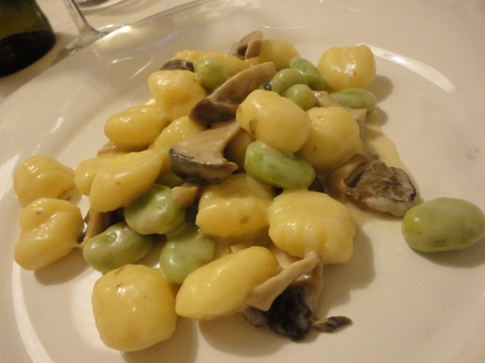 Anche qui la materia prima la fa da padrona, esaltata ma non coperta da un ottimo olio proveniente da due cultivar del calibro dellla coratina e dell’ogliarola. Deliziosissima l’ “Insalatina di carciofi, seppia e mentuccia“, in bell’evidenza l’aromatico della mentuccia sevatica a bilanciare le componenti dolci e amarostiche degli altri due ingredienti. Per caso ci troviasmo a tavola anche un piatto di terra : ” Gnocchetti con funghi cardoncelli fave fresche e pecorino“.