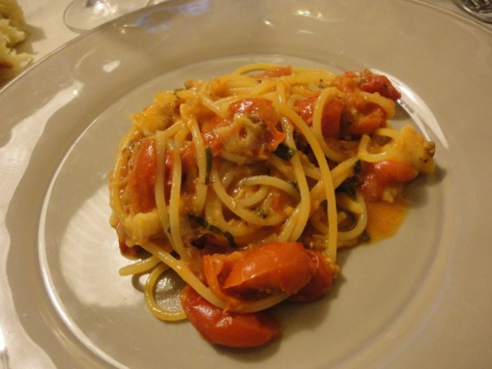 Gnocchetti fatti con farina di grano della Puglia (è o non è il granaio d’Italia?) e patate, tirati con cardoncelli e pecorino dop stagionato 18 mesi. So di destare incredulità per chi legge, ma credetemi, veramente l’abbiamo mangiata …tutta questa roba!!! E siccome al posto dello stomaco abbiamo un pozzo senza fondo, continuiamo con uno “Spaghetto allo scorfano“. Cottura al chiodo, pomodorini di Torre Guaceto, materia prima, viste le premesse, scontatamente straordinaria.