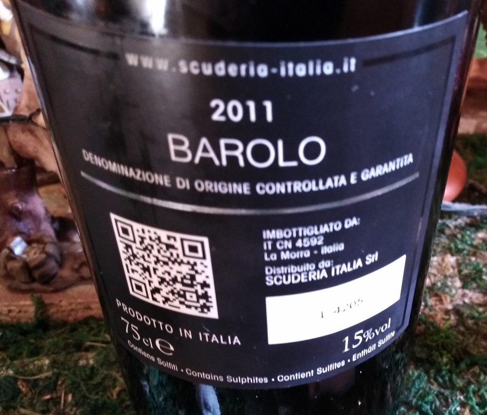 Bene questo è l’antefatto, il seguito riguarda la mia recente degustazione di una bottiglia di Barolo Docg 2011 della Scuderia Italia di Flavio Sartori a Natale. Nebbiolo in purezza allevato nei vocati territori di La Morra, Barolo e Monforte, su un terreno di natura argilloso-limoso. Vendemmia a fine settembre. Dopo la fermentazione in acciaio il vino matura in barriques per sei mesi e due anni in botti grandi, prima di essere affinato in vetro. Tasso alcolico di quindici gradi. Prezzo in enoteca di 76,00 euro.