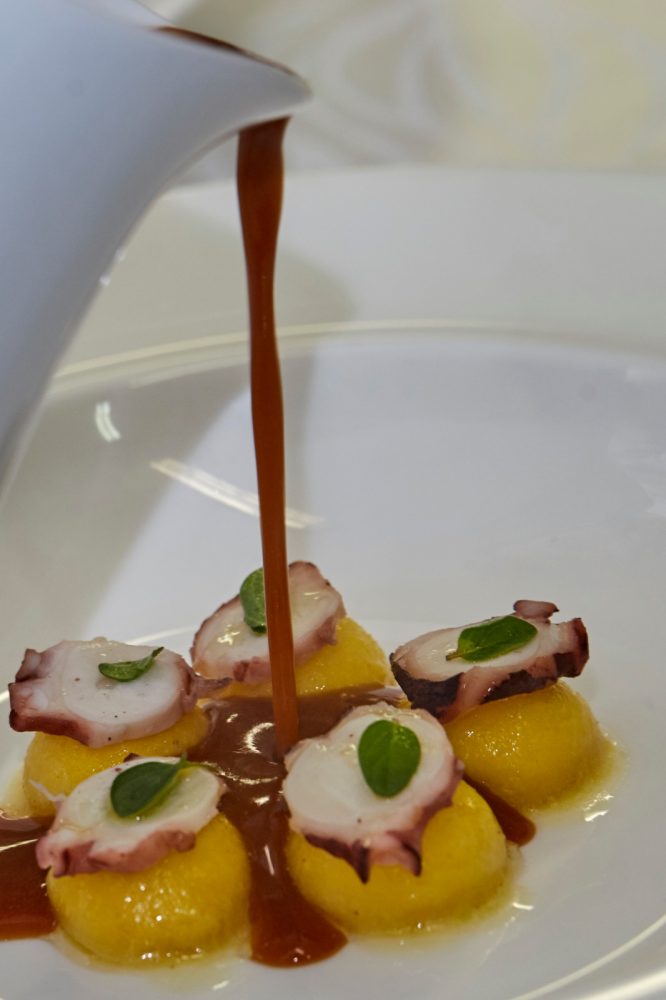 Bottone di olio e lime con salsa di caciucco e polpo arrosto