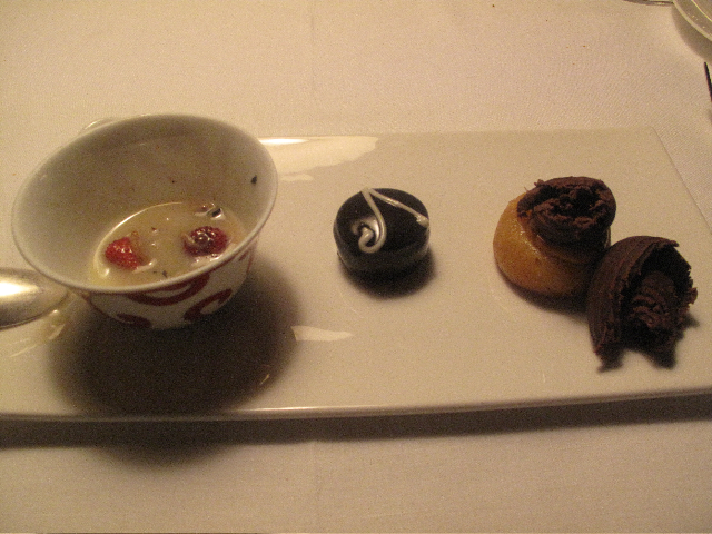 Certo giravano cose strabilianti, frutto della mente talvolta perfino troppo aperta del NOSTRO: ZUPPA DI PAPAYA AL PROFUMO DI COCCO, CAPPELLACCI DI MIRTILLO, TARTARA DI TONNO; GNOCCHI DI BANANE, ARAGOSTA, AL PROFUMO DI ROSMARINO;GAMBERI DI FIUME , PORRI, DELIZIE DI BISCOTTO ALL’ARMAGNAC E soufflé DI TACCOLE AL TARTUFO NERO;FAGIANELLA, RHUM E PERE KAISER, PAPPARDELLE AL RHUM.