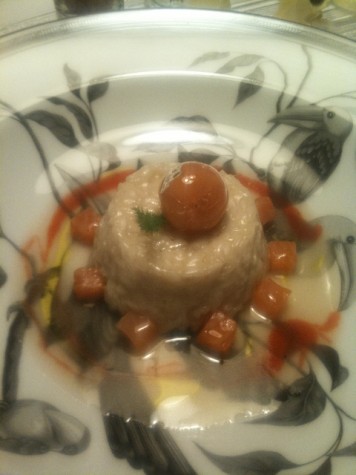 Signori, non me la voglio tirare ma di risotti un po’ ne capisco fra quelli fatti e quelli felicemente subiti: questo sta’ nell’Olimpo. Nella pallina ghiacciata perfino un po’ di leggera e sana chimica. Suadente , goloso , il rosè si sente esatto e deve pure essere sopraffino, la fragola insiste, l’affumicatura del salmone è misuratissima.
