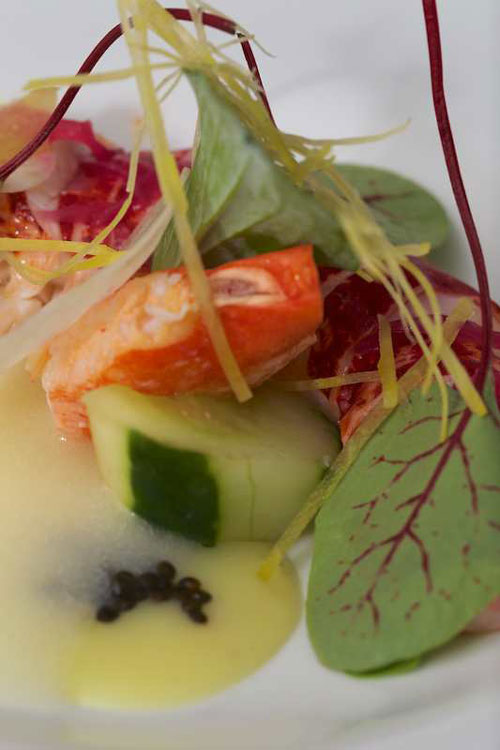 Astice bretone (soggiungo io di 3-400 grammi circa a persona) cotto in court bouillon di verdure e poi marinato nella citronella (lemon grass) servito con zeste sottilissime di limoni, zenzero, cetriolo, caviale Beluga Malasol e gazpacho di melone. Sicuramente l’astice più buono che abbia mangiato sino ad oggi. Peccato che nel mio piatto il gazpacho, versato in diretta dinanzi ai commensali, sia finito sul caviale coprendolo. Anche qui il verbo credere ha svolto il suo ruolo. Denny, calabrese di Paola trapiantato a Parigi, crede nella multietnicità e nella terra che lo ospita e in quella di provenienza e nel piatto lo si legge tutto. L’astice bretone fuso con il limone e il gazpacho freddo di melone, lo zenzero, il lemon grass e il caviale a rimarcare le contaminazioni.