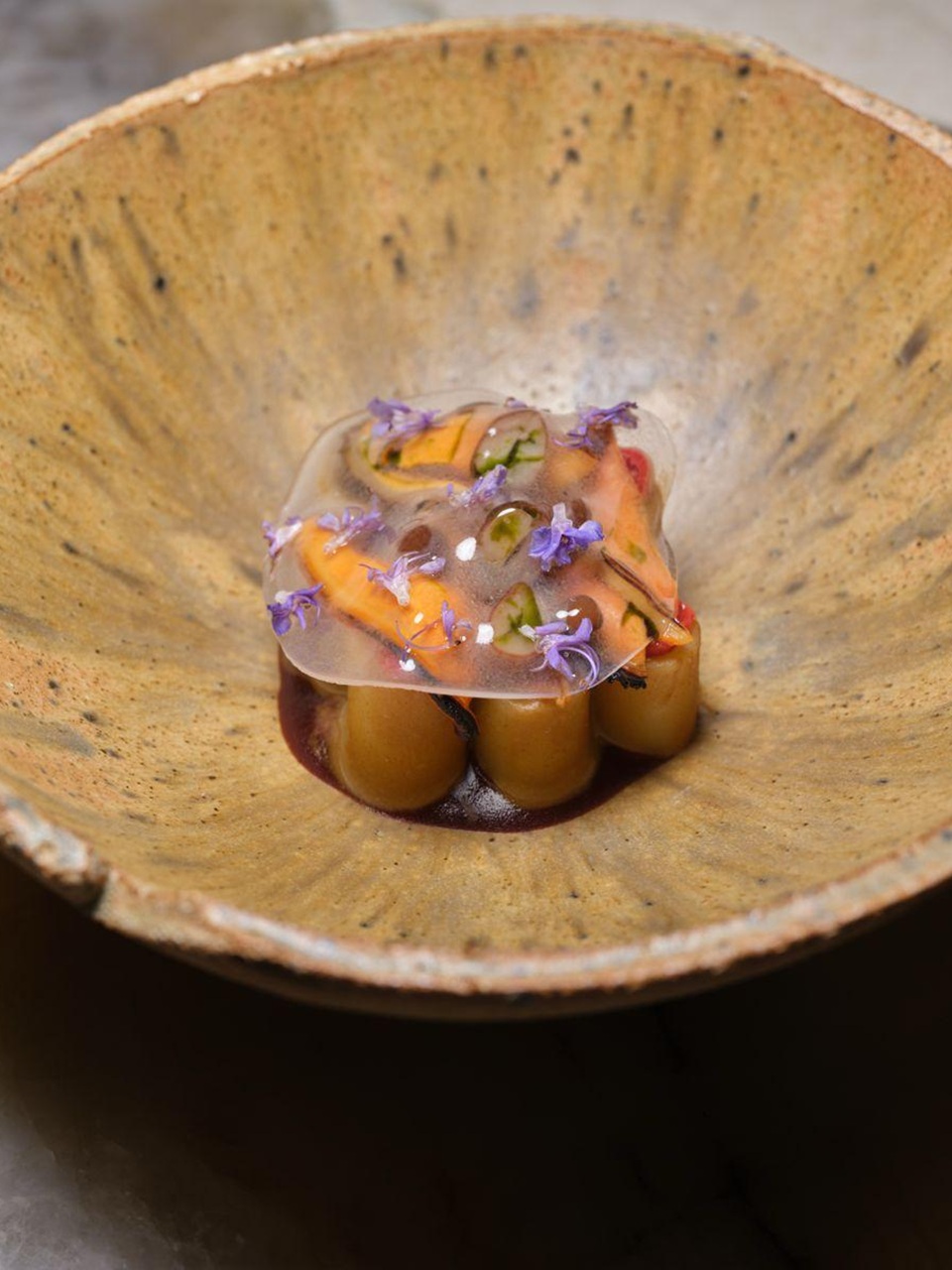 Coprire delicatamente il tutto con il sashimi di cozze, quindi completare il piatto adagiandovi sopra il velo trasparente di acqua di cozze e fiori di rosmarino.