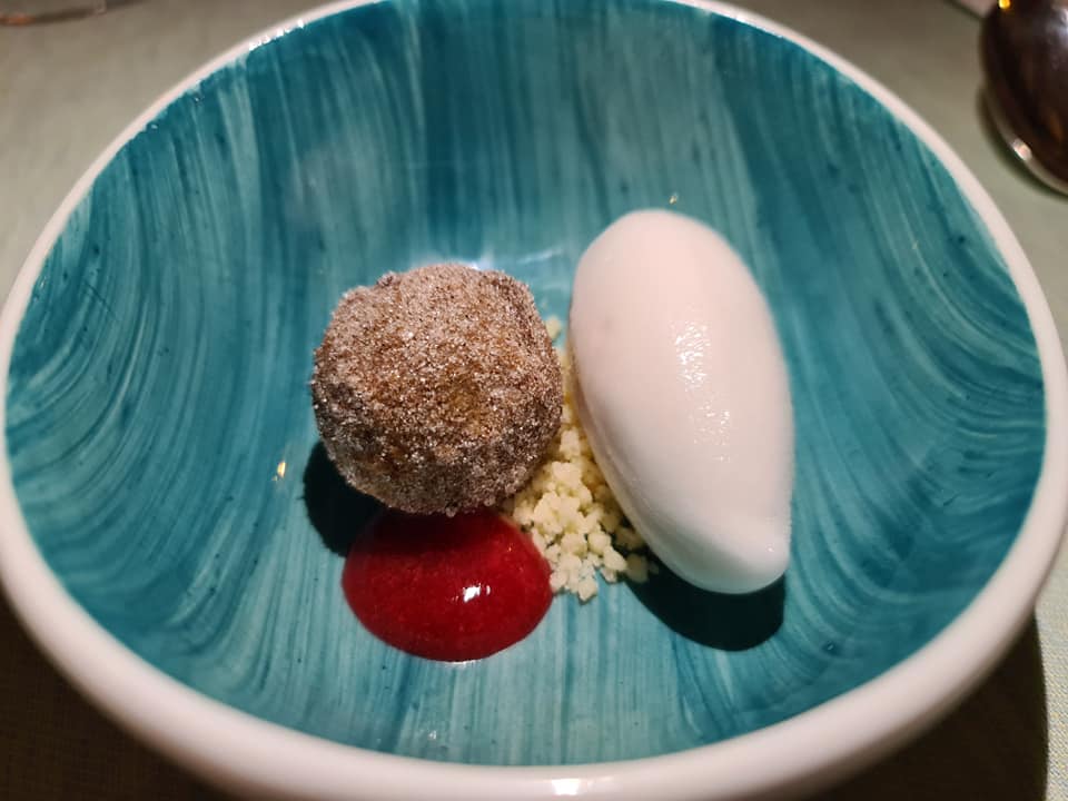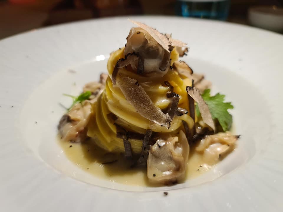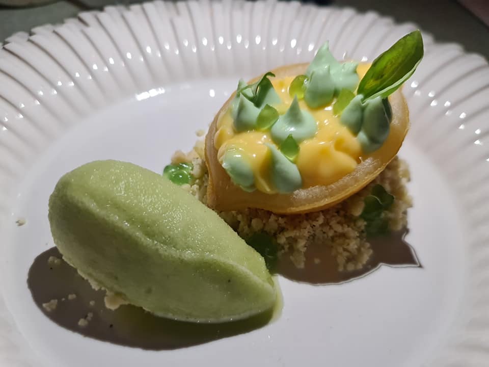 Tortelli e linguine, molto golosi, ti fanno entrare a pieno nel mood di questa cucina. Materia prima di vicinato, vera, relax assoluto anche a tavola, per godere del paesaggio e della bellezza di tutto quello da cui si è circondati. Spigola in olio cottura con cocco e taccole, anche qui rispetto delle cotture e della materia prima. Spettacolare il dolce con il limone macerato a freddo. Con un processo abbastanza complesso, questo dolce trasferisce intatte tutte le micro sfumature del limone, amplificandole, senza avere zuccheri superflui, davvero delizioso.