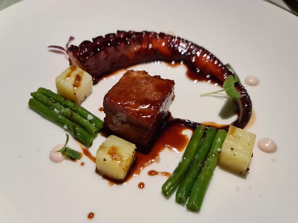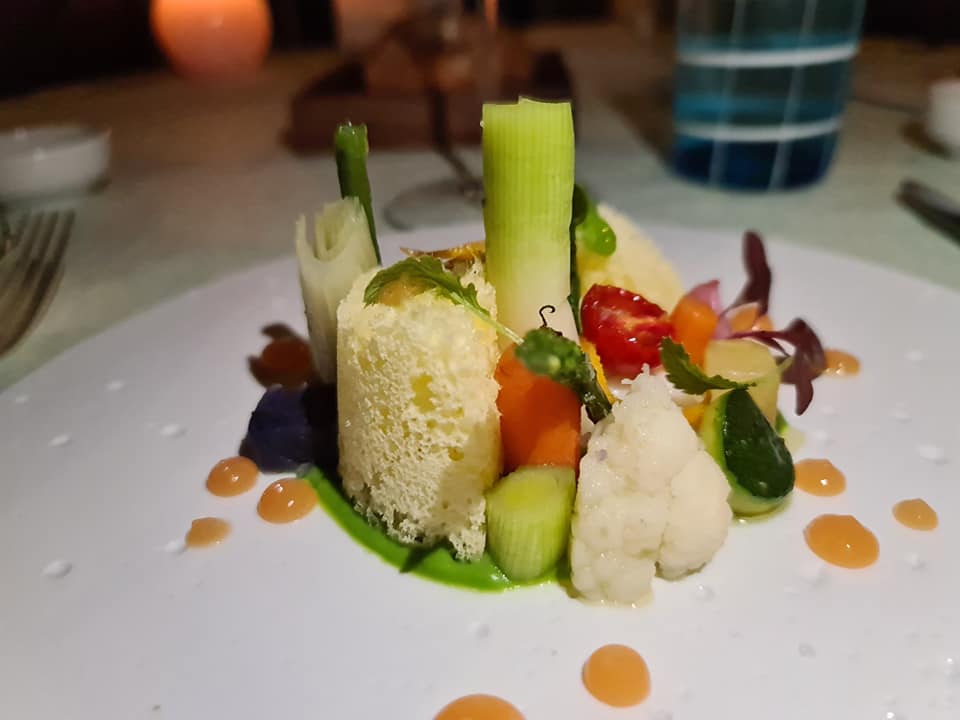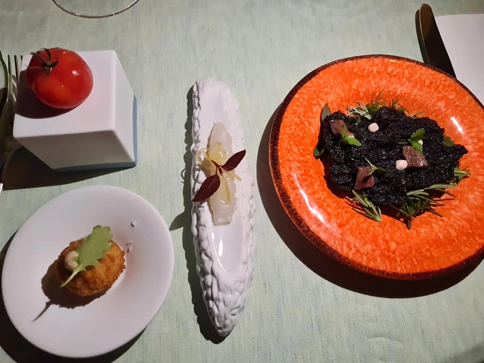 La prima riflessione che mi viene in mente, che qualche anno fa, in un ristorante di un hotel 5 stelle lusso, per i primi 3 piatti avrei mangiato qualcosa con un paio di cucchiai di caviale. Oggi non è così, perché la percezione stessa del lusso è diversa. Il primo piatto servito è sono delle verdure del loro orto. Carote, zucchine, porri, patate violee cipollotti, scampo e agrumi a seguire insalata di polpo e pancetta con fagiolini e patate di Montoro affumicate. Ben fatti, cotture precise, tanta semplicità, che non vuol dire assolutamente facile.