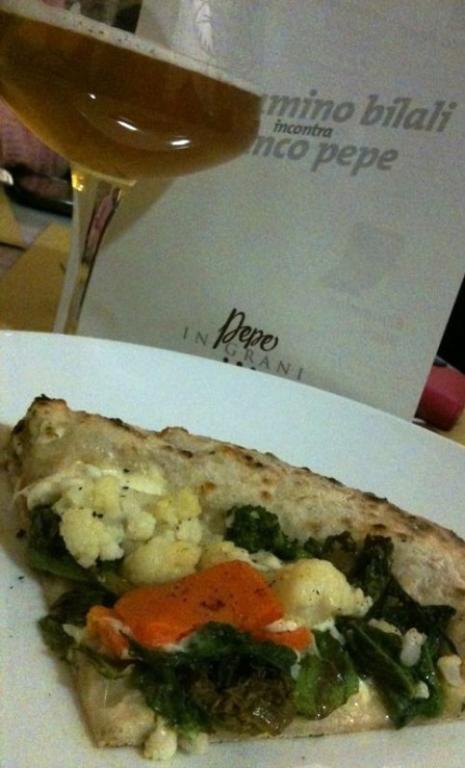 Il Calzone del Casolare di Pepe riassume in un sol spicchio l’amore per la propria terra, la mozzarella dop, la scamorza affumicata, la ricotta di bufala dell’amico Mimmo la Vecchia, presente in sala, il salame di maiale nero casertano, il patè di olive caiazzane si fondono in un impasto soffice e attraente. Karma Klaus in abbinamento ambrata scura, fruttata e floreale.